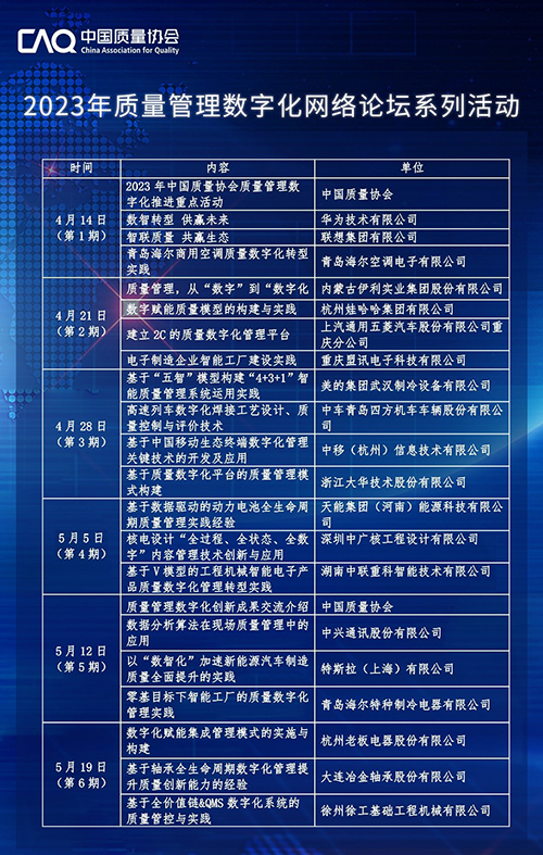 2023年4月14—5月19日,中国质量协会连续举办六期质量管理数字化网络论坛系列活动,累计超过6000人次观看学习。