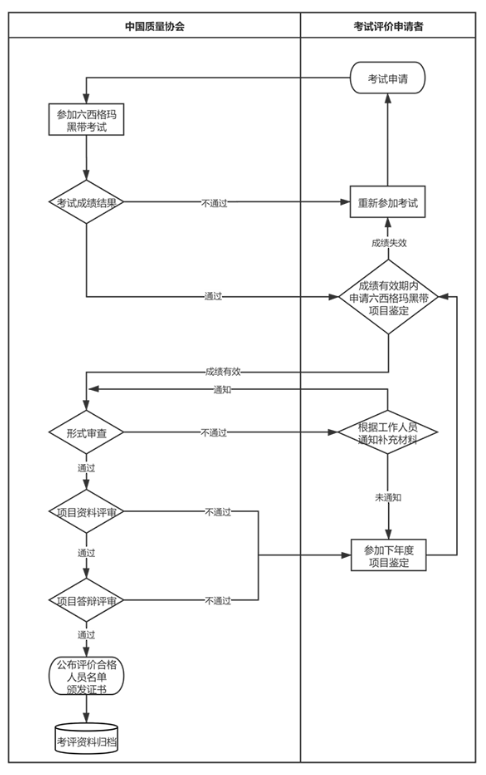 网上申请成功后,请将《六西格玛黑带项目评价申请表》(附件1),《六西格玛黑带项目评价表》(附件2)盖章原件、考试成绩合格证书复印件一并邮寄至中国质量协会。