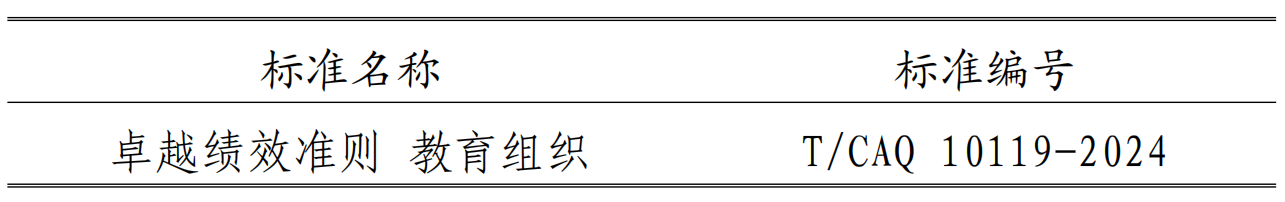 根据《中国质量协会团体标准管理办法》的相关规定,中国质量协会批准发布《卓越绩效准则 教育组织》团体标准,自2024年1月15日起实施。标准名称及编号如下。