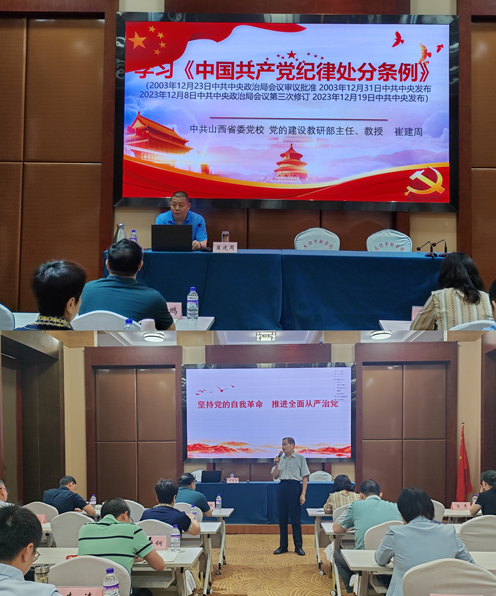来自山西省委党校的崔建周教授以《<中国共产党纪律处分条例>解读》为题进行授课,带领大家从《条例》历次修订中找到全面从严治党的规律性认识,并通过修订前后条文对比解析及违纪案例分析相结合的方式,对《条例》条文脉络进行了系统解读;高建生教授以《坚持党的自我革命 深入推进全面从严治党》为题,从马克思主义执政党的性质宗旨、新时代党的中心任务要求等方面阐释了“为什么要以自我革命推进从严治党”,并从强化自我革命的认知警觉、完善制度机制、探索和把握自我革命规律等5个方面讲解了“深入推进全面从严治党的路径在哪里”。两位专家的授课内容丰富、案例详实、深入浅出,对于大家全面准确理解《条例》的丰富内涵,增强推进自我革命的思想自觉、政治自觉、行动自觉,具有较强的指导作用。