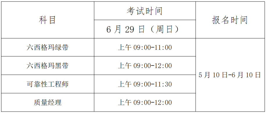 2025年6月考试批次科目包括六西格玛绿带、六西格玛黑带、可靠性工程师、质量经理。