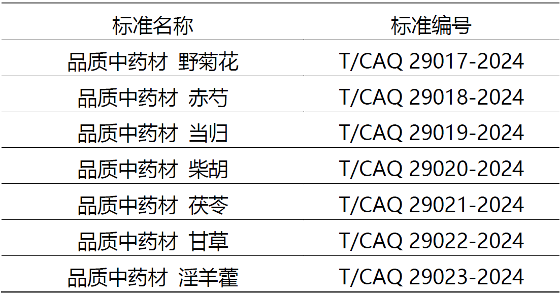 根据《中国质量协会团体标准管理办法》的相关规定,中国质量协会批准发布《品质中药材 野菊花》等七项团体标准,自2024年12月31日起实施。标准名称及编号如下: