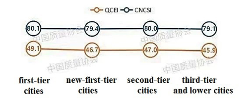 b.The quality customer experience in first-tier cities is the best, and the experience in the third-tier and below cities has the highest improvement comparing with previous year. CNCSI and QCEI in the first-tier cities are the highest. Meanwhile, customer satisfaction in third-tier and below cities increase significantly (CNCSI increased by 0.5, QCEI increased by 8.7), and the gap of customer satisfaction between cities gradually narrow.
